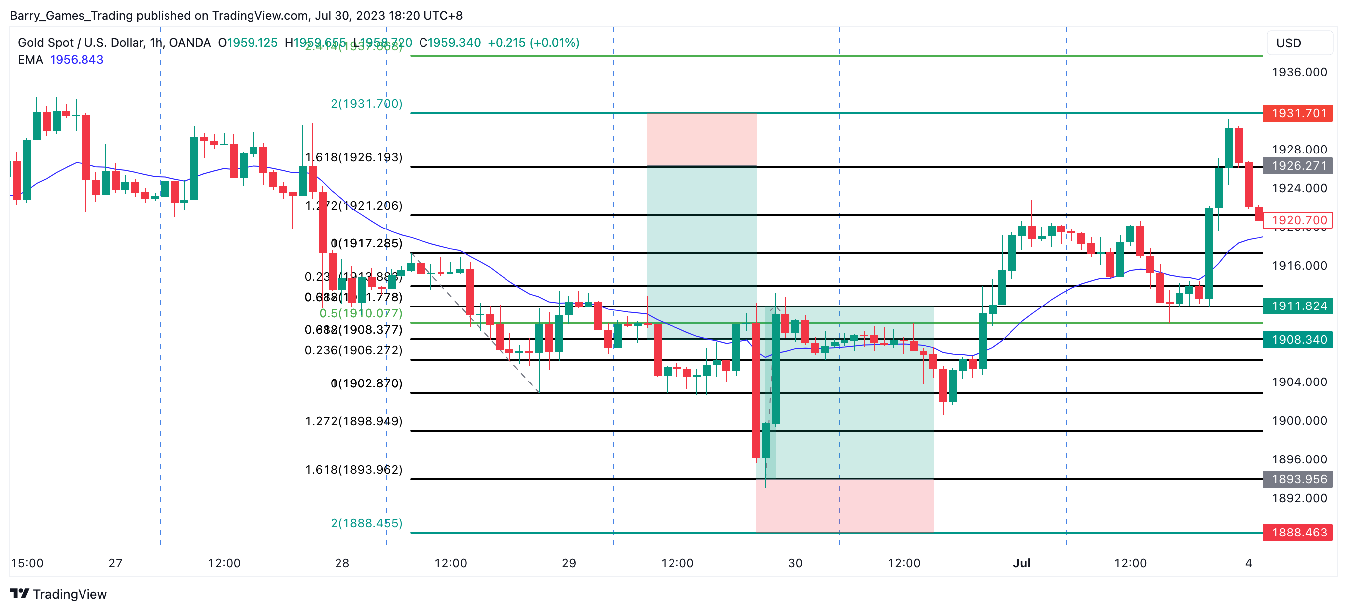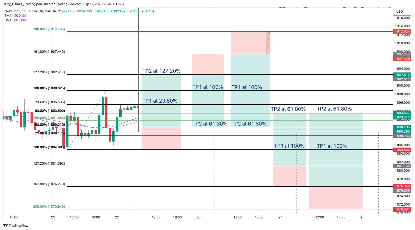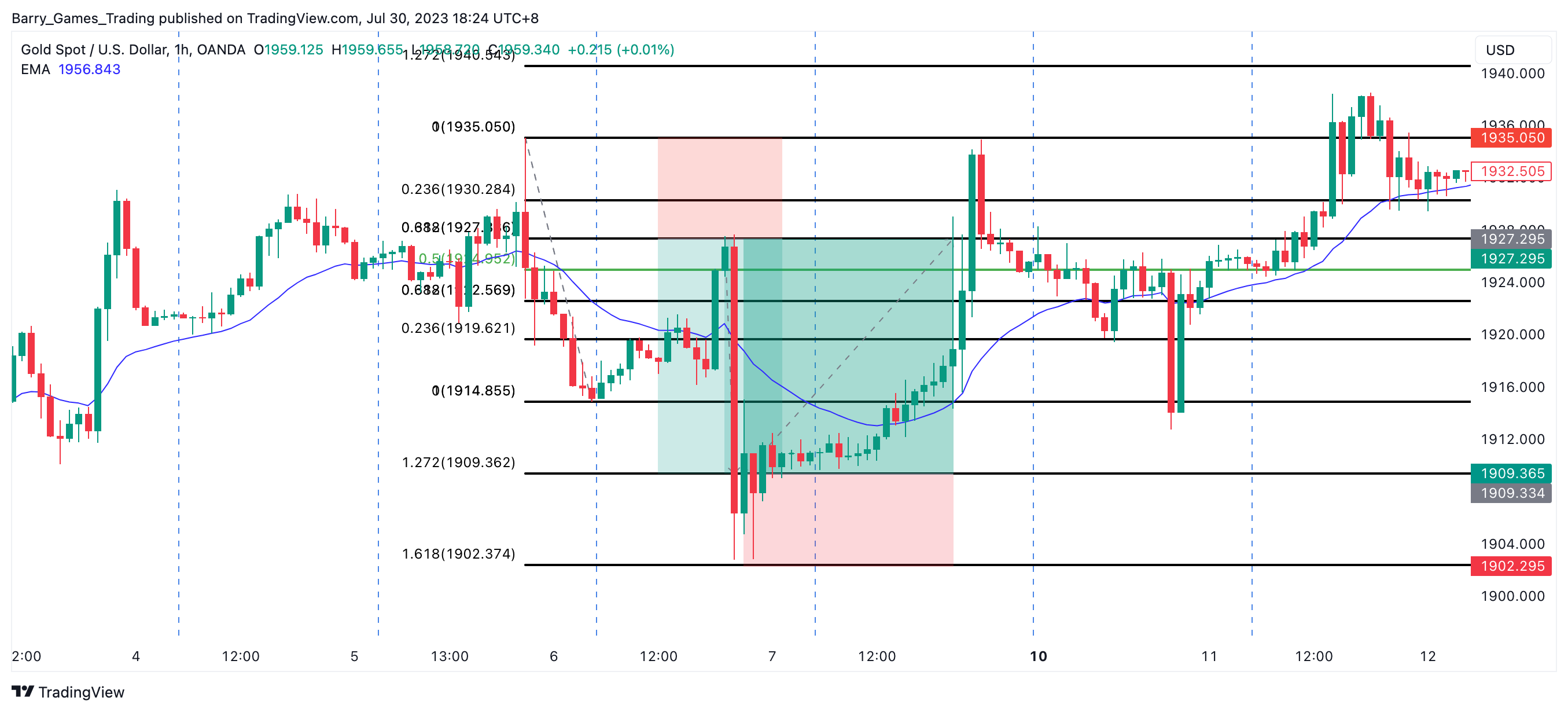 Entry: $1927.336 (61.80% level of the blue Fibonacci)