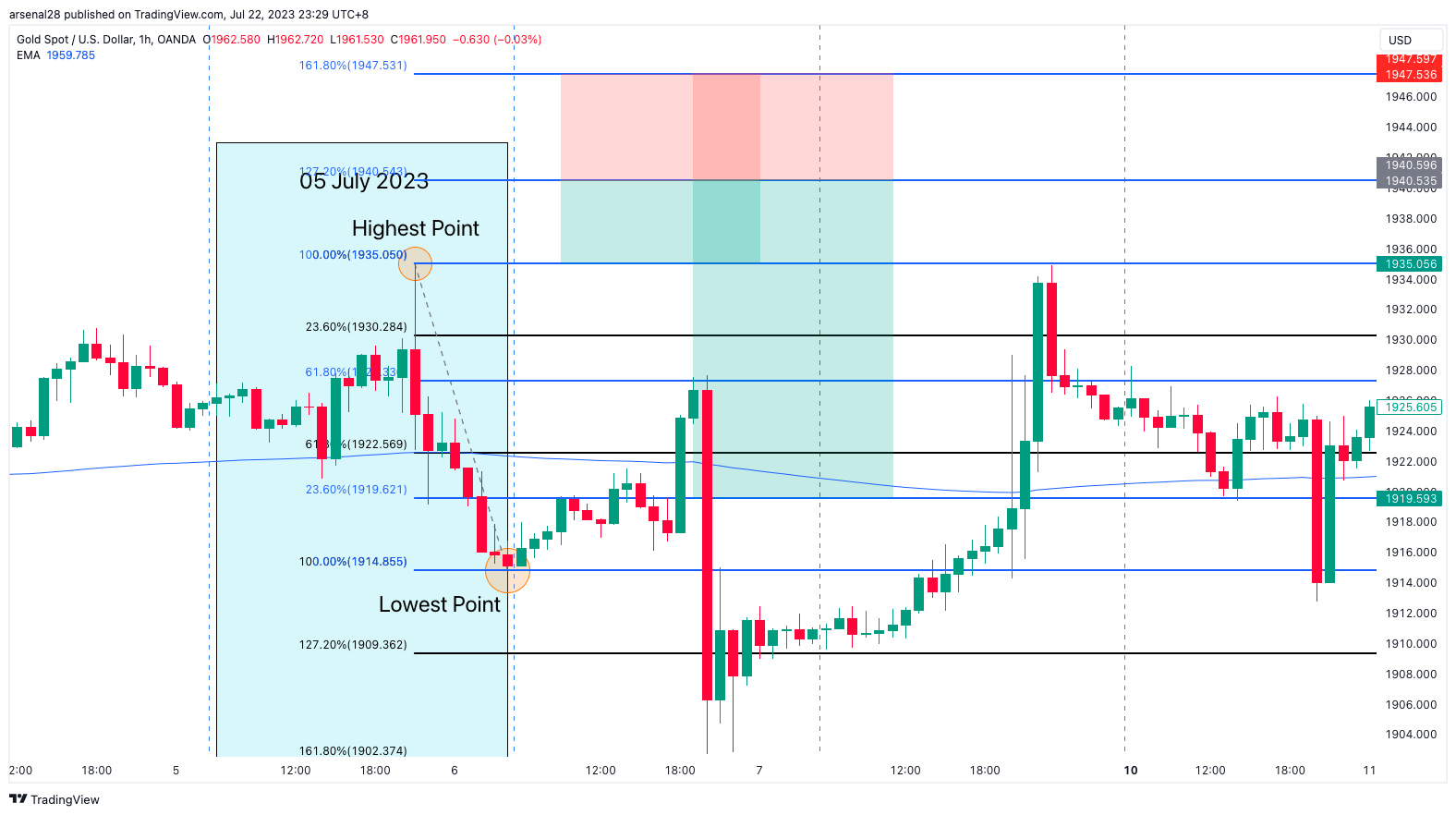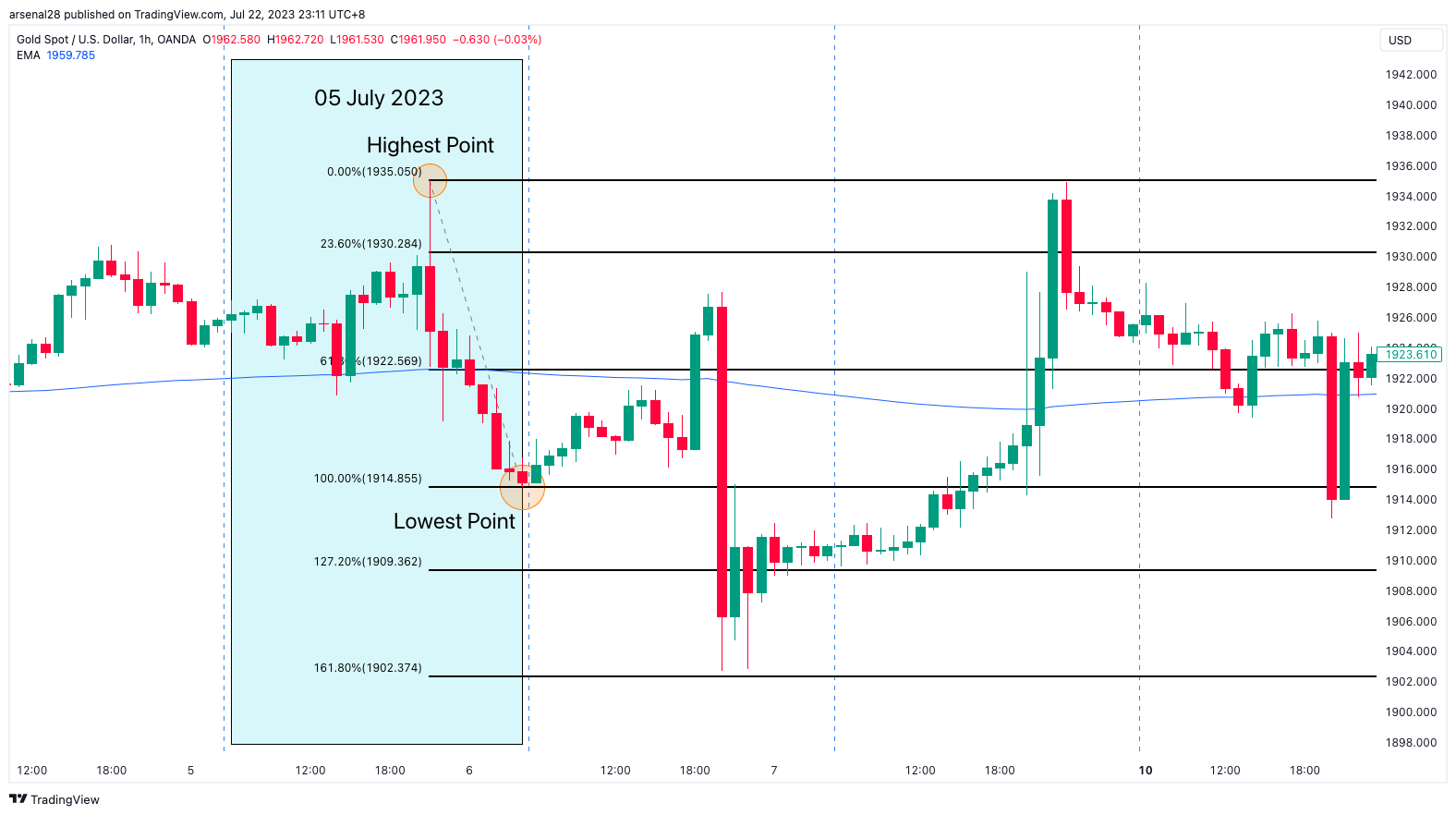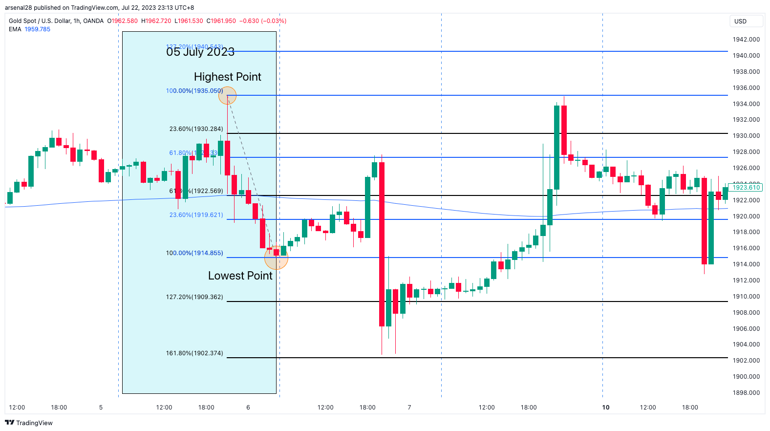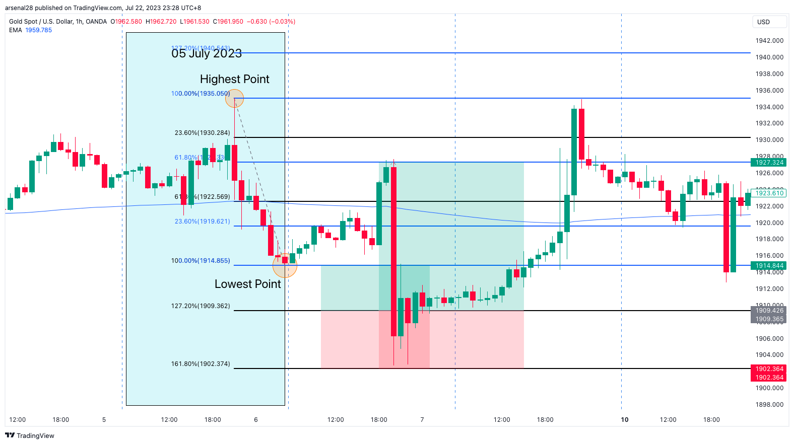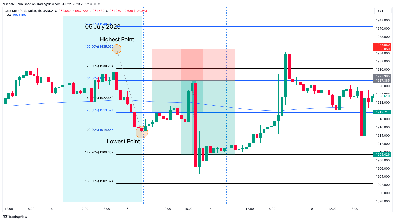 Mark out the previous day's (05 July 2023, blue box) highest to lowest point using the 2x Fibonacci tool.